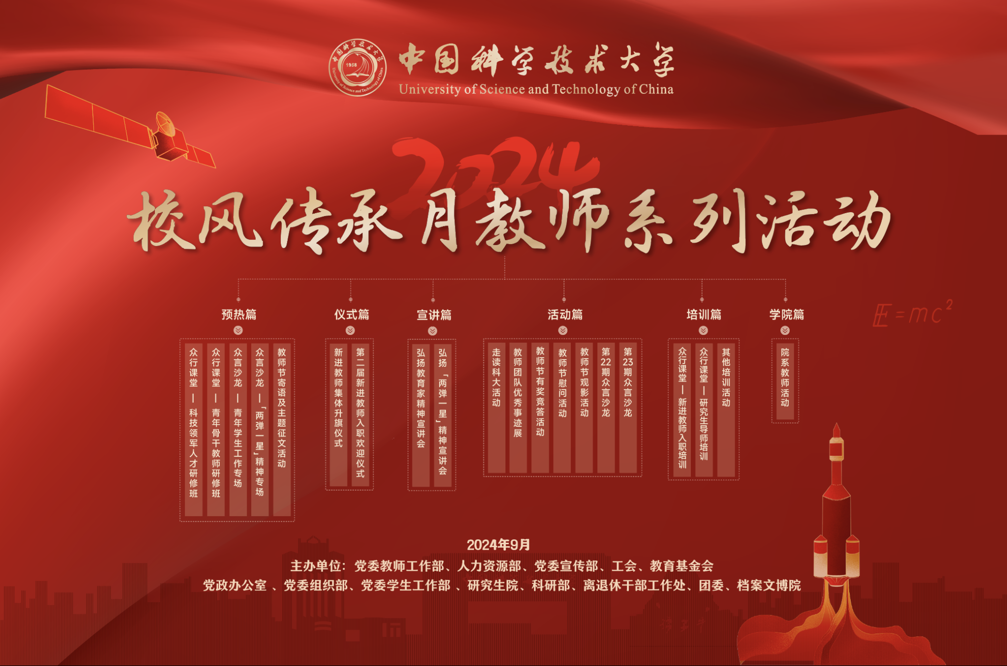 在第40个教师节和66周年校庆来临之际,根据教育部及安徽省有关文件精神,为进一步加强新形势下师德师风建设,教育引导广大教师传承优良校风,涵养高尚师德,学校决定在全校范围开展2024年校风传承月教师系列活动。现将有关安排通知如下。