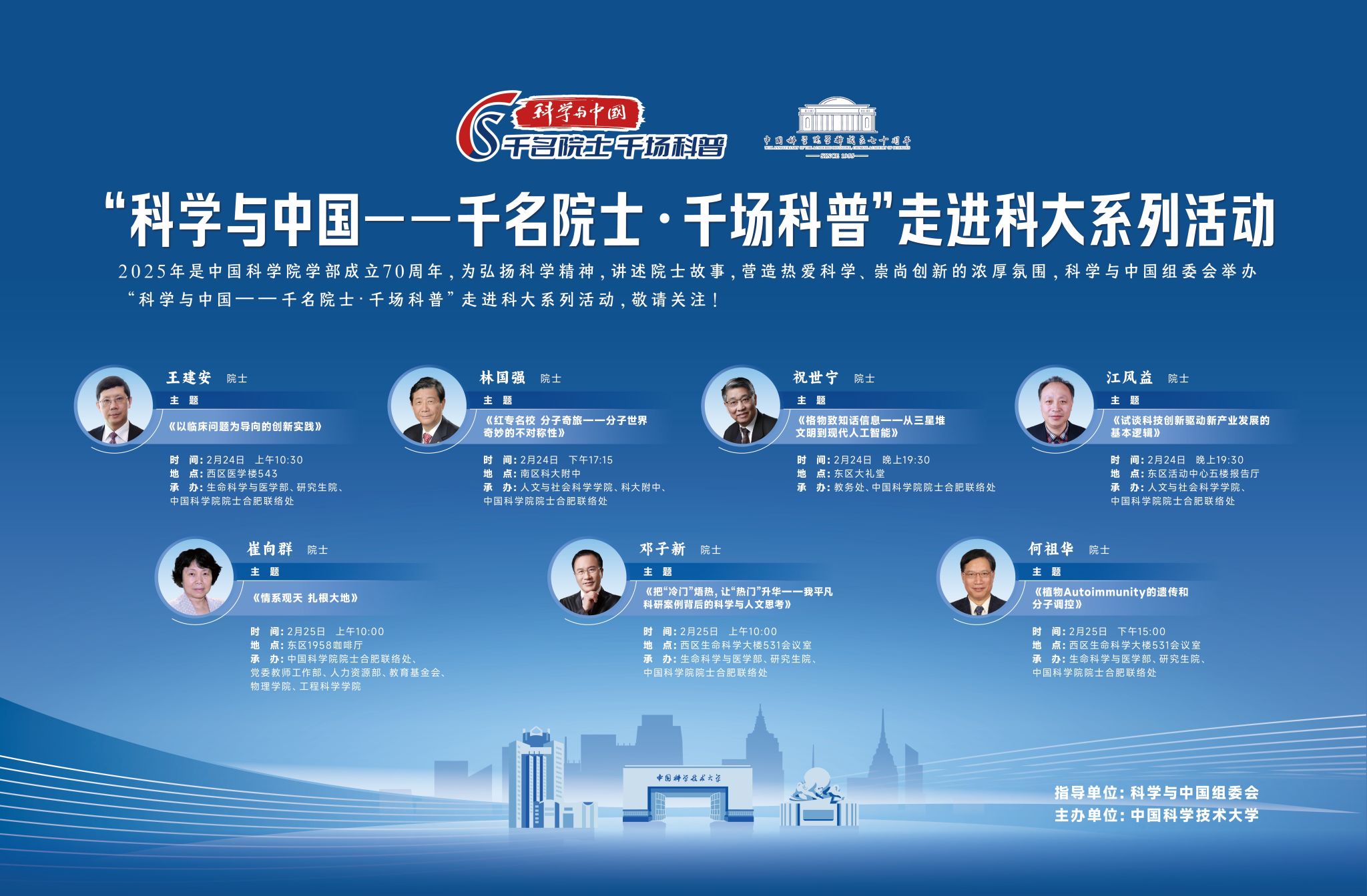 2025年是中国科学院学部成立70周年,为弘扬科学精神,讲述院士故事,营造热爱科学、崇尚创新的浓厚氛围,科学与中国组委会举办“科学与中国——千名院士·千场科普”走进科大系列活动,欢迎感兴趣的师生参加!