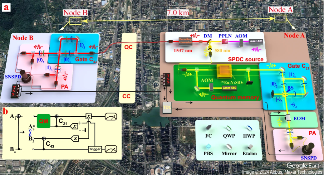 图1:跨越7公里的非局域量子门。a.量子节点分布地图和实验装置图; b.量子门隐形传送的逻辑线路图