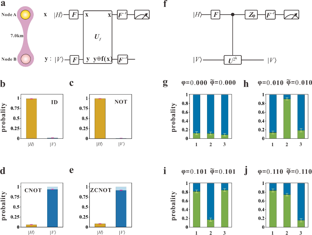 图2:分布式量子计算算法的演示。a-e.Deutsch-Jozsa算法的逻辑线路图和实验结果;f-j.量子相位估计算法的逻辑线路图和实验结果